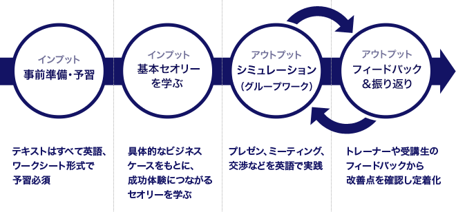 レッスンの始めに、ビジネスの成功体験を生み出す、コミュニケーションの基本セオリーを学びます。そして、実際の ビジネスケースを題材に、学んだセオリーをすぐにシミュレーション。受講生同士がグループとなって課題に取り組 みます。教師や他の受講生からのフィードバックを受けながらシミュレーションを繰り返すことで、ビジネス現場で すぐに活用できるスキルがより短期間で身につくように設計されています。